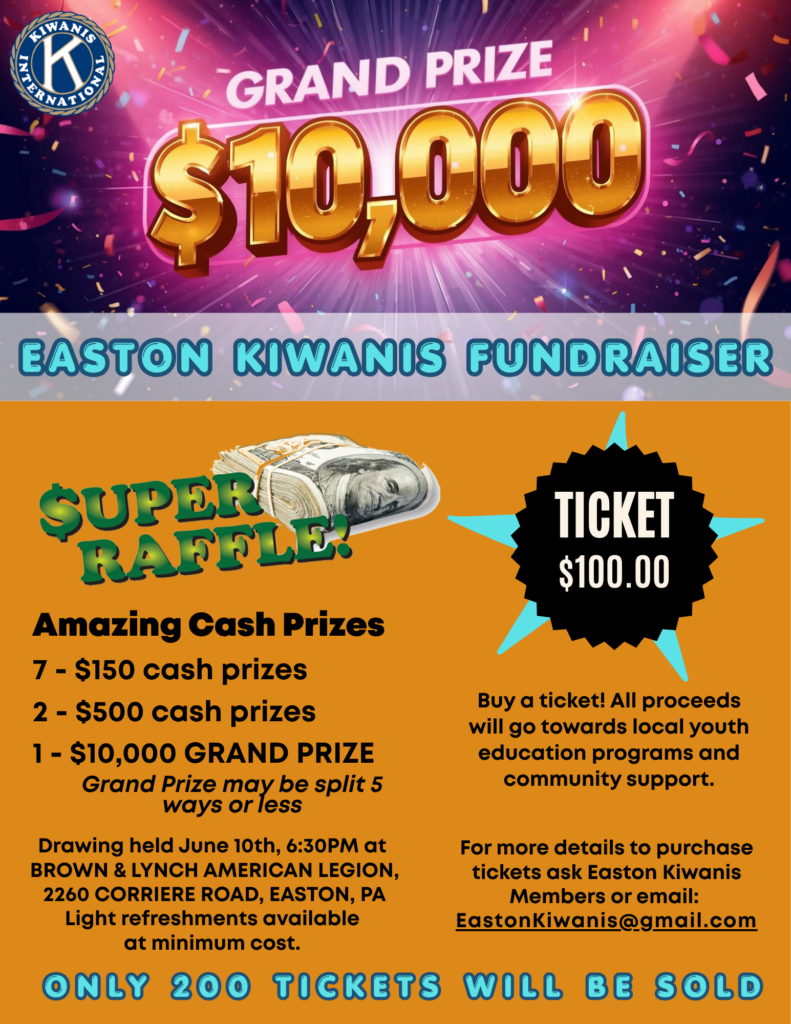 June 10, 2026 will be the Super Raffle. The event will be held at the Brown & Lynch American Legion Post 9, 2260 Corriere Road, Easton, PA. Door open 5:30PM-drawing 6:30PM. Super Raffle and Super 50:50 tickets are available to anyone over 21 years old. Over $12,500 in Super Raffle prizes and the Super 50:50 tickets are only $10. For more information email: [email protected]You can click this link to make a copy of the flyer below.